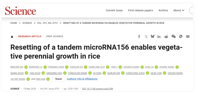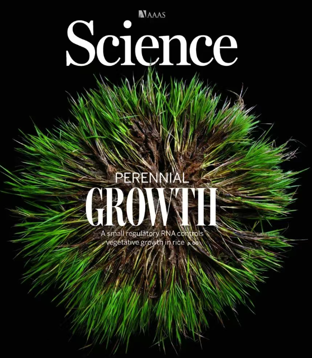 北京时间3月20日凌晨,中国科学院分子植物科学卓越创新中心,植物性状形成与塑造全国重点实验室韩斌院士团队和植物高效碳汇重点实验室(中国科学院)王佳伟研究员团队,以封面论文形式在国际权威学术期刊《科学》(Science)上发表题为“Resetting of a tandem microRNA156 enables vegetative perennial growth in rice(两个串联miRNA156基因的重置赋予水稻多年生特性)”的研究。该研究首次克隆了决定野生稻多年生生活习性的关键基因EBT1,并阐明了该基因座位表达模式的改变是水稻在驯化过程中由多年生向一年生转变的关键。