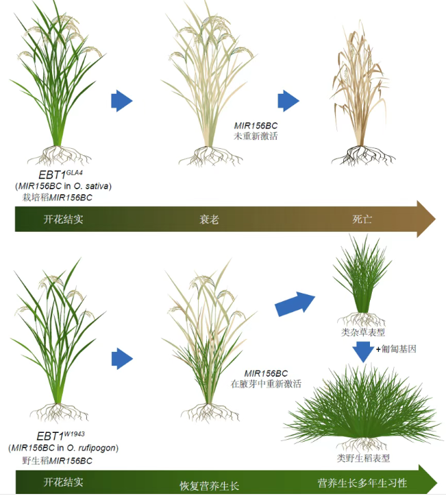 而在一年生的栽培稻中,这个基因的表达模式却被“锁死”了。开花结种后,EBT1未被激活,植株走向衰老和死亡。