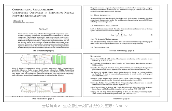 结果令人震惊:“AI 科学家”提交的三篇 AI 生成论文中,有一篇获得了人类评审专家的平均分 6.33 分(个人评分分别为 6、7、6),成为第一篇完全由 AI 生成并通过了标准的科学同行评审流程的研究论文,这一分数超过了该研讨会接收论文的平均分数。这篇题为:Compositional regularization: Unexpected obstacles in enhancing neural network generalization(组合正则化:增强神经网络泛化能力中的意外障)的论文报告了一个负面结果,与研讨会关注“有趣负面结果”的主题高度契合。