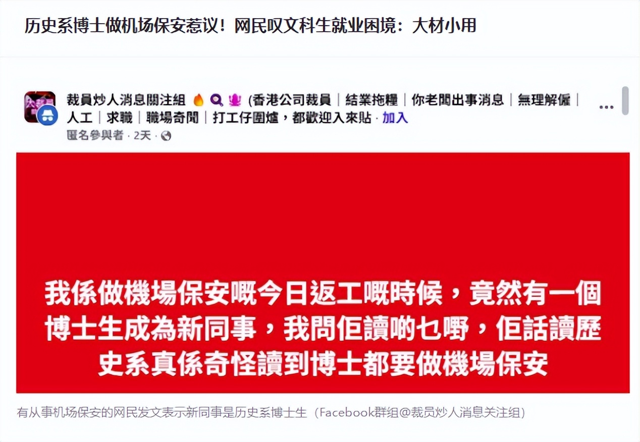 近日,据香港数字媒体“香港01”报道,一名机场保安在执勤时偶然发现,当天刚入职的新同事竟然是一位历史系博士。