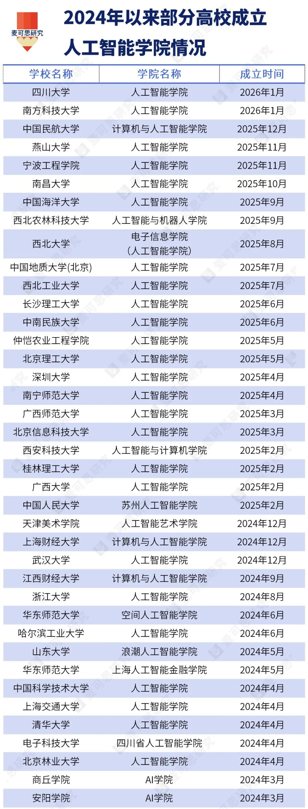 仅2025年一年,中国人民大学、北京理工大学、西北工业大学、中国海洋大学、西北农林科技大学等20余所高校密集成立了人工智能学院。