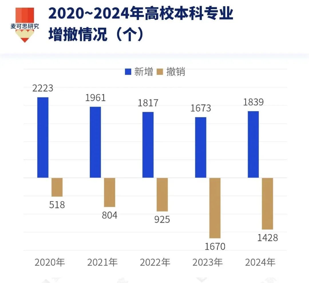 根据麦可思研究基于教育部数据统计,2020至2024年间,全国本科新增和审批专业布点共9513个,同时撤销专业布点达到5345个。
