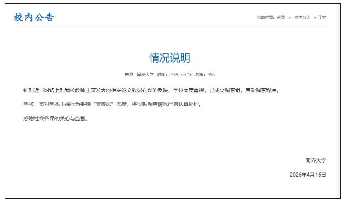 4月16日,同济大学在校内新闻网发表情况说明,全文如下——