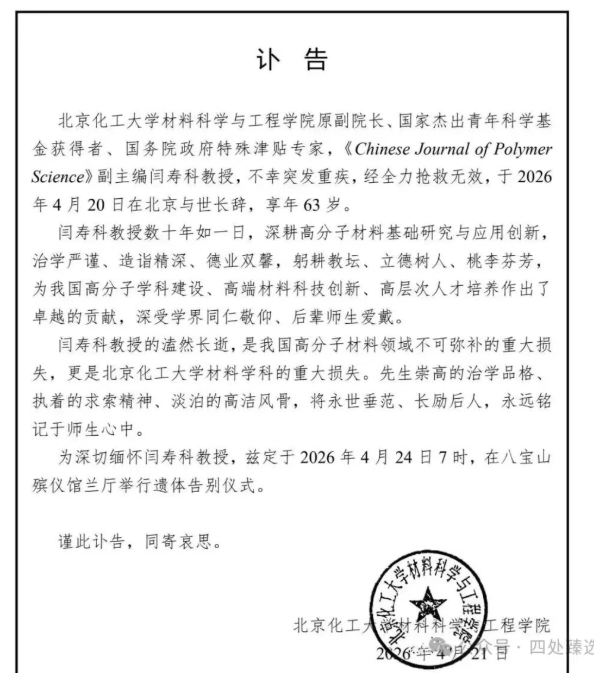 据澎湃新闻记者确认:著名高分子材料专家、北京化工大学材料科学与工程学院原副院长闫寿科教授,于2026年4月20日在北京因病逝世,享年63岁。