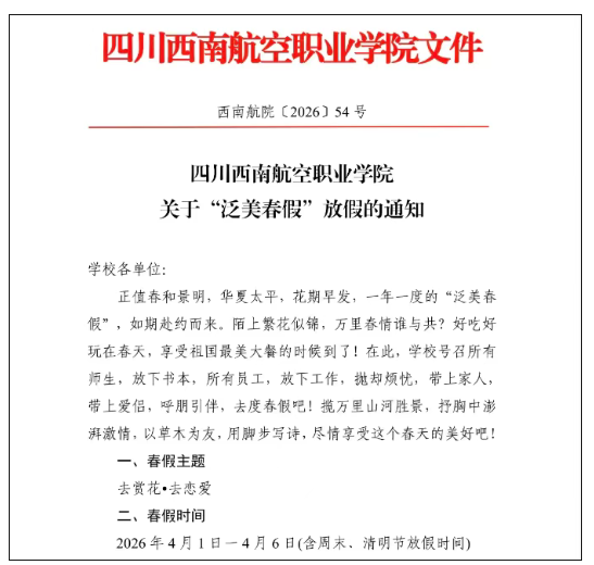 四川西南航空职业学院关于“泛美春假”放假的通知:春假时间为2026年4月1日—4月6日(含周末、清明节放假时间)。