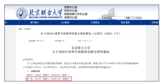 北京联合大学关于2026年清明节放假和春假安排的通知:春假放假时间为4月7日(星期二)至4月12日(星期日)。