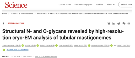 2026年4月23日,深圳医学科学院/深圳湾实验室颜宁,清华大学黄隽豪及闫创业共同通讯在Science 在线发表题为“Structural N- and O-glycans revealed by high-resolution cryo-EM analysis of tubular mastigonemes”的研究论文,该研究报告了来自金藻物种Ochromonas danica的管状鞭毛体的冷冻电子显微镜结构,这些结构的分辨率为 1.8 - 2.2 埃。