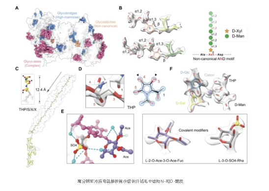 在高半乳糖型和复杂 N-糖链之外,该研究还发现了一个在 Ala-Asn-Asp(AND)基序上的非标准 N-糖链。表面突起由密集的 O-糖链覆盖着 PSXX 四肽重复序列,每个重复序列上有两个糖链连接在三羟基脯氨酸上,还有一个在丝氨酸上。除了各种类型的糖及其共价修饰物之外,水分子(占已解析体积的 10%以上)和阳离子也清晰可见,并且它们介导了结构的组装。总之,该研究为研究高阶生物组装中的糖折叠提供了框架。