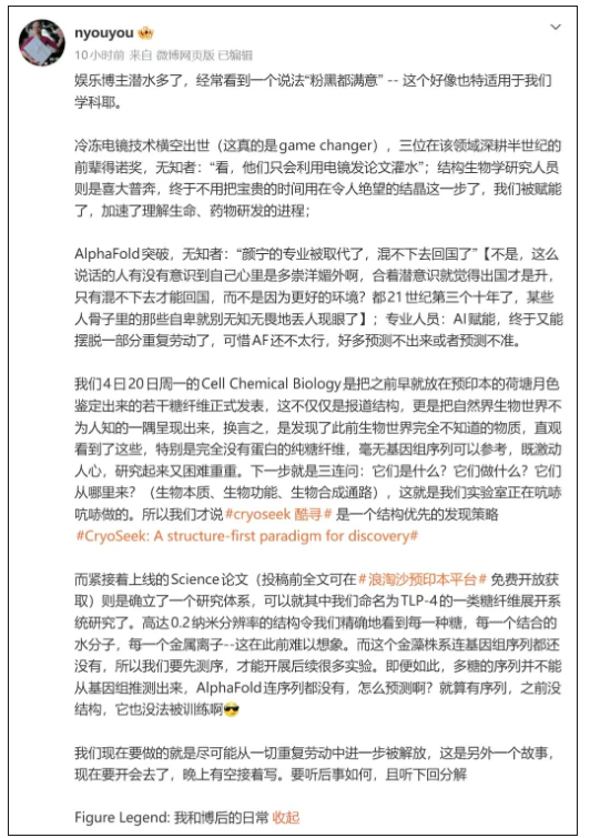 4月26日,颜宁院士通过个人微博发文:“娱乐博主潜水多了,经常看到一个说法‘粉黑都满意’——这个好像也特适用于我们学科耶。冷冻电镜技术横空出世(这真的是game changer),三位在该领域深耕半世纪的前辈得诺奖,无知者:‘看,他们只会利用电镜发论文灌水’;结构生物学研究人员则是喜大普奔,终于不用把宝贵的时间用在令人绝望的结晶这一步了,我们被赋能了,加速了理解生命、药物研发的进程。”