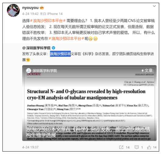 颜宁院士本人也通过微博转发了上述消息,并表示,“选择浪淘沙预印本平台需要理由么? 1. 我本人曾经至少两篇CNS论文被审稿人偷信息抢发; 2. 现在每天无数所谓正规审稿的论文正式发表,但是造假、数据错误不胜枚举; 3. 预印本无人审稿更反映对自己学术声誉的爱惜。 所以,有什么理由不先发布在浪淘沙预印本平台呢?”